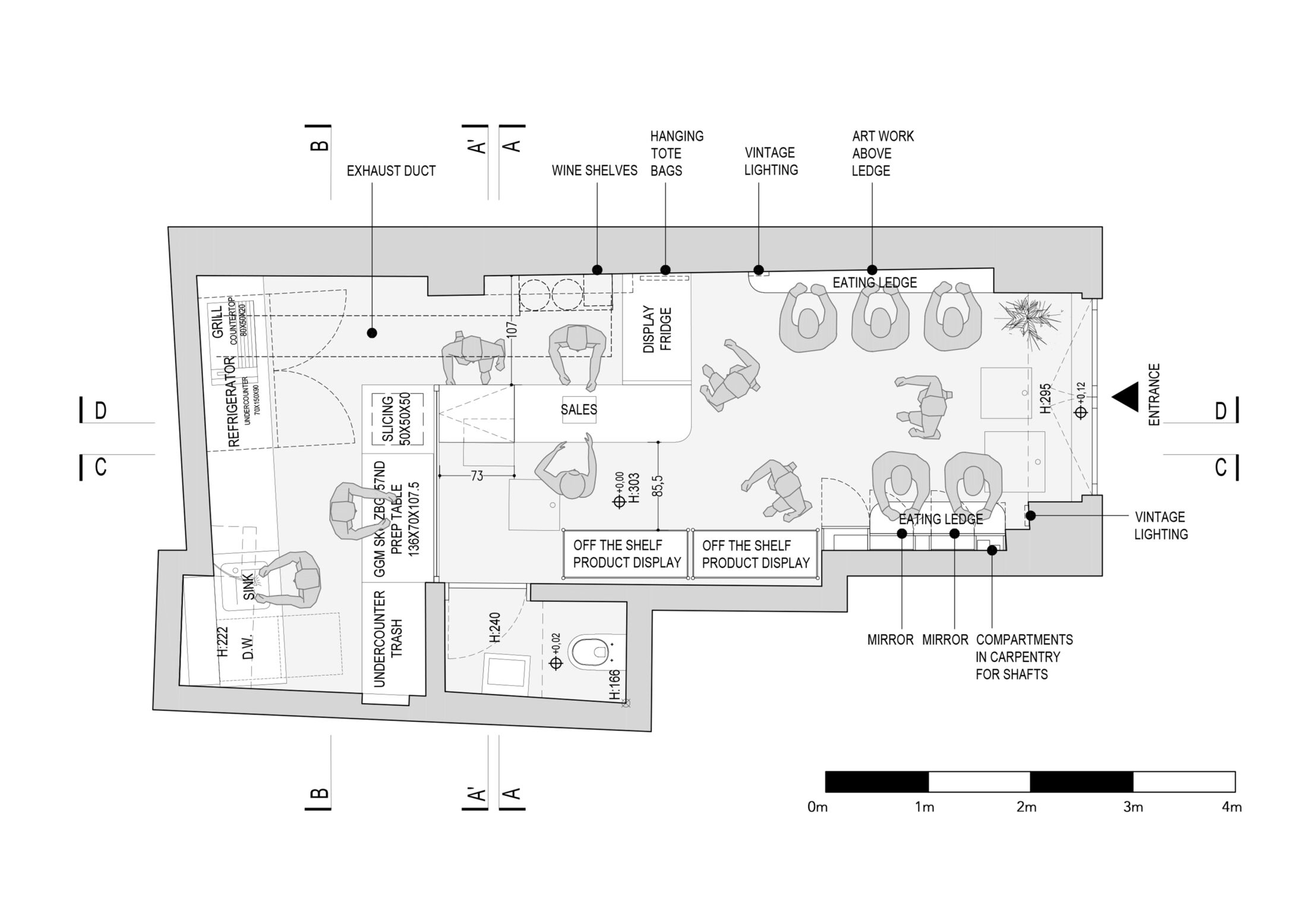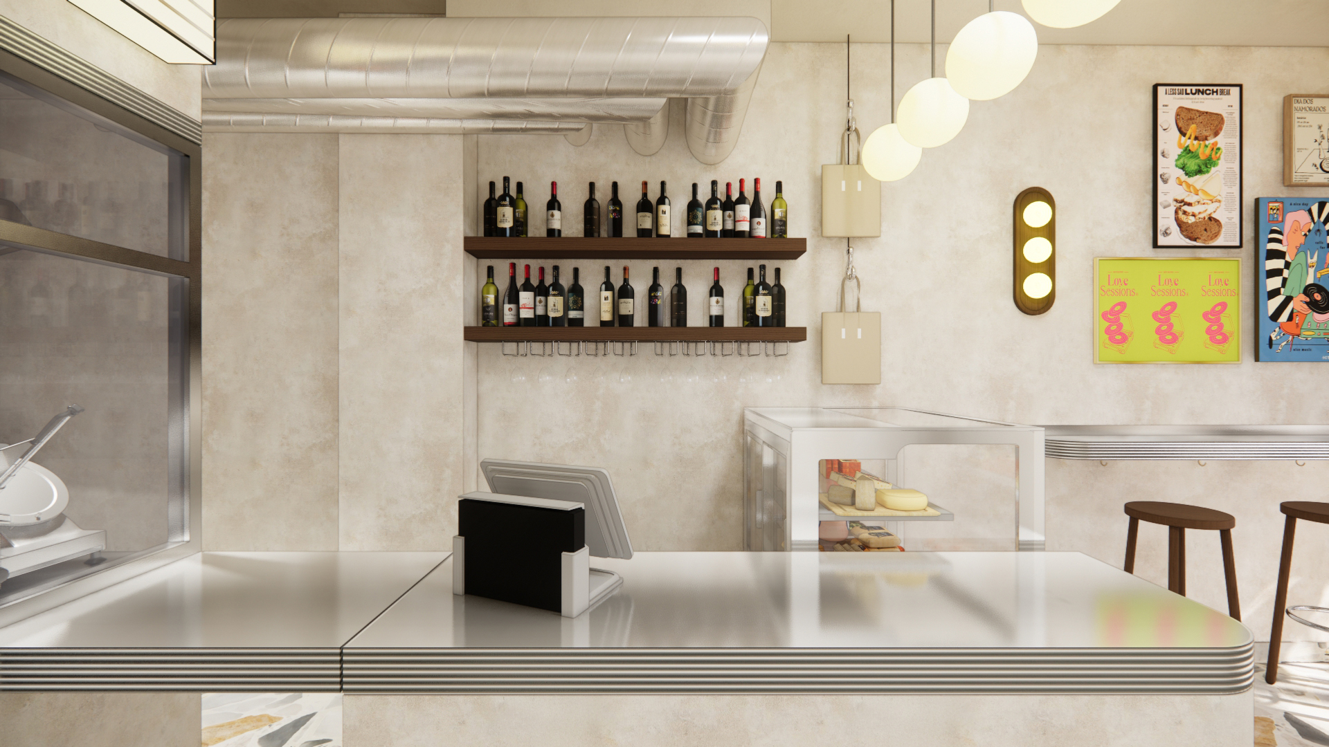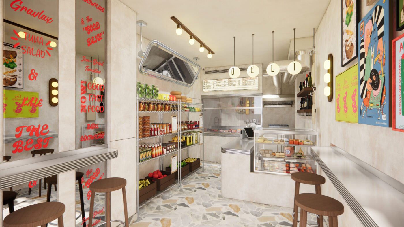 The open kitchen remains visible throughout the experience, highlighting the preparation of sandwiches, snacks, and daily specials. Clear product displays and honest materials reinforce the deli’s straightforward approach to food: simple, quick, and good.
