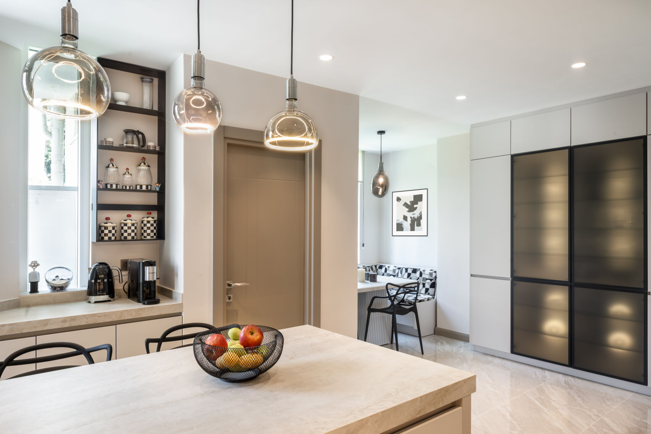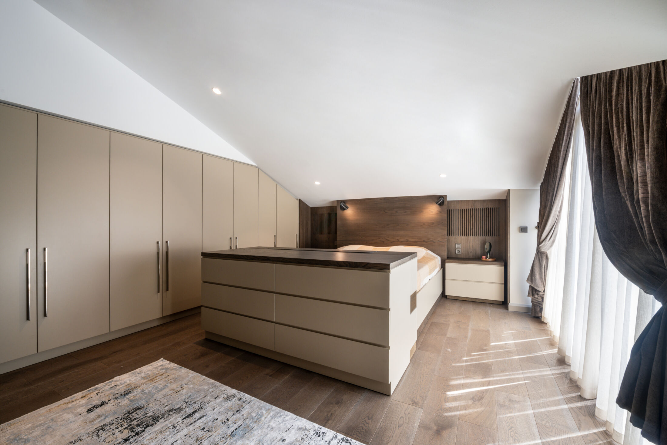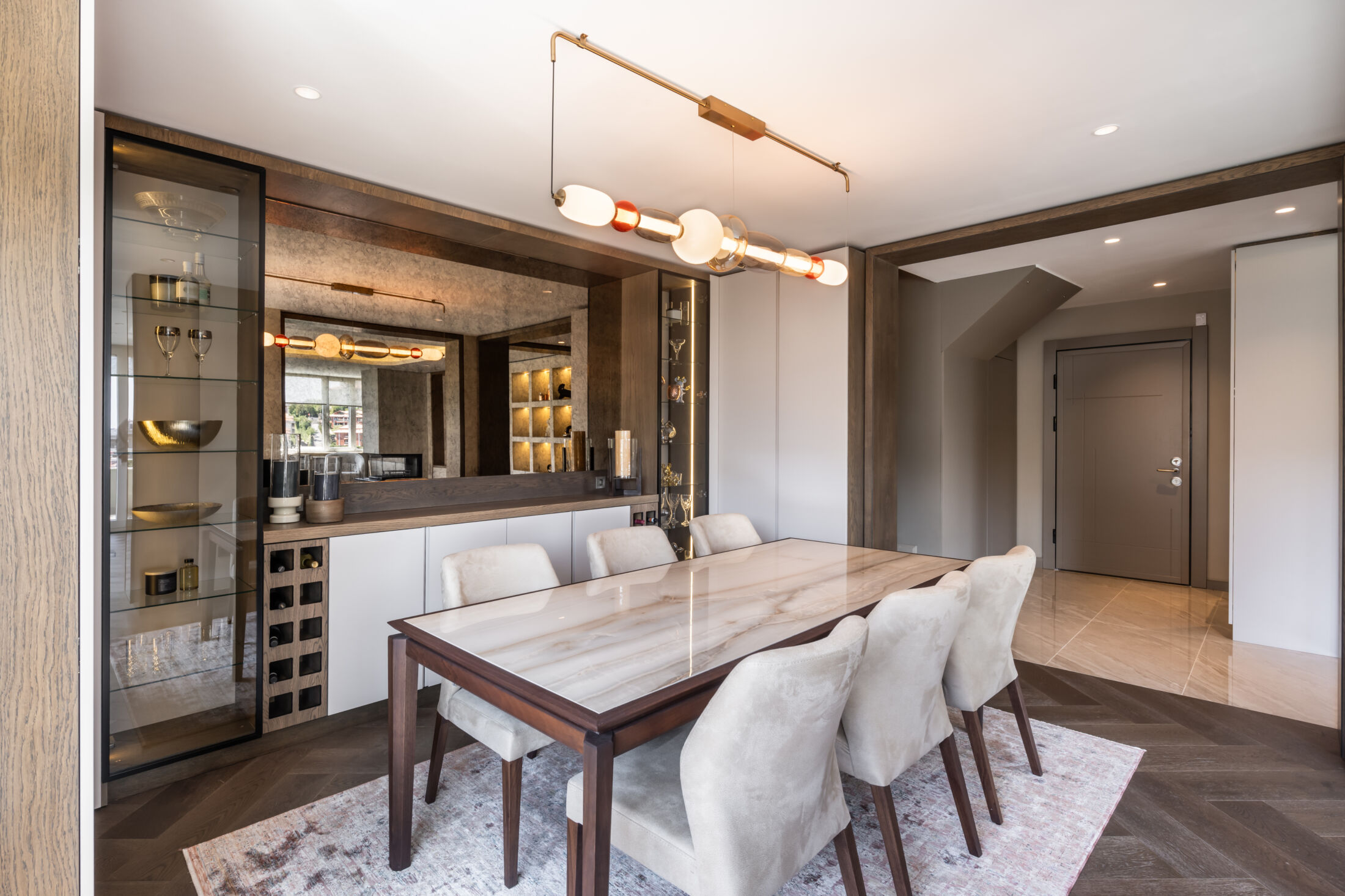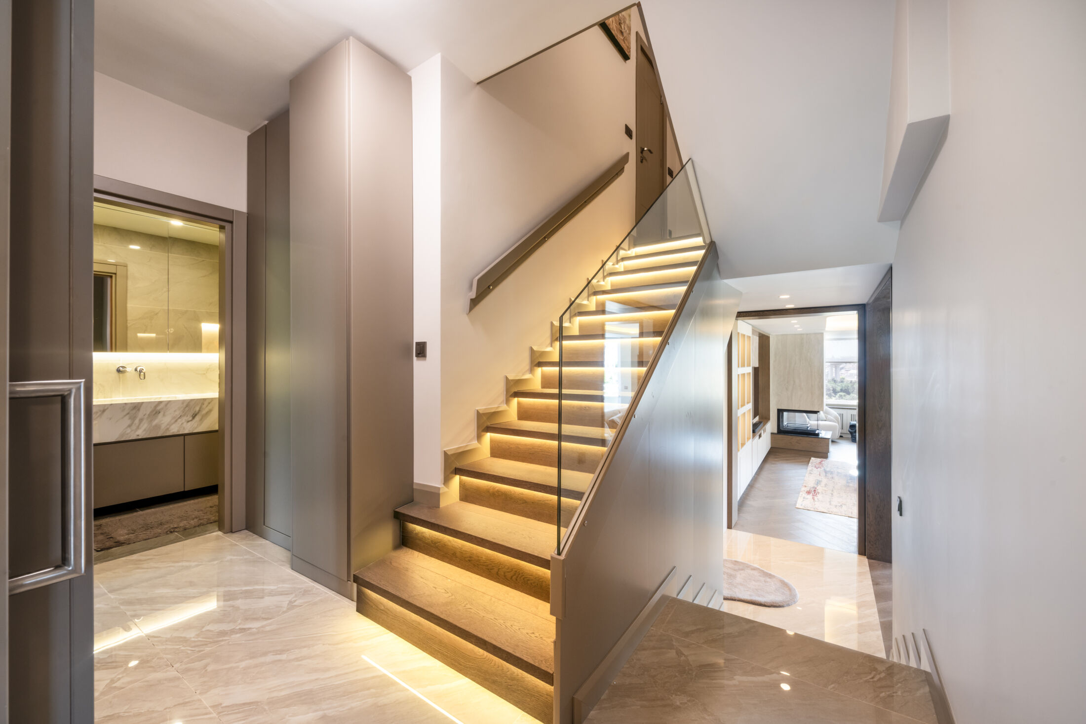 Upon reaching the upper floor, a transitional hall leads to the primary bedroom, which features a private terrace and an en-suite bathroom, offering both comfort and privacy. An additional elevated platform within this level houses a study, a dressing room, and a shared bathroom, creating a distinct yet connected functional arrangement. Bathrooms feature expansive glass partitions and natural stone surfaces, enhancing light and continuity. A staircase with integrated lighting acts as a sculptural element, connecting the spaces seamlessly. Throughout the house, concealed lighting and material textures create an understated yet sophisticated ambiance, making ENO House a contemporary living space shaped for comfort and everyday elegance.