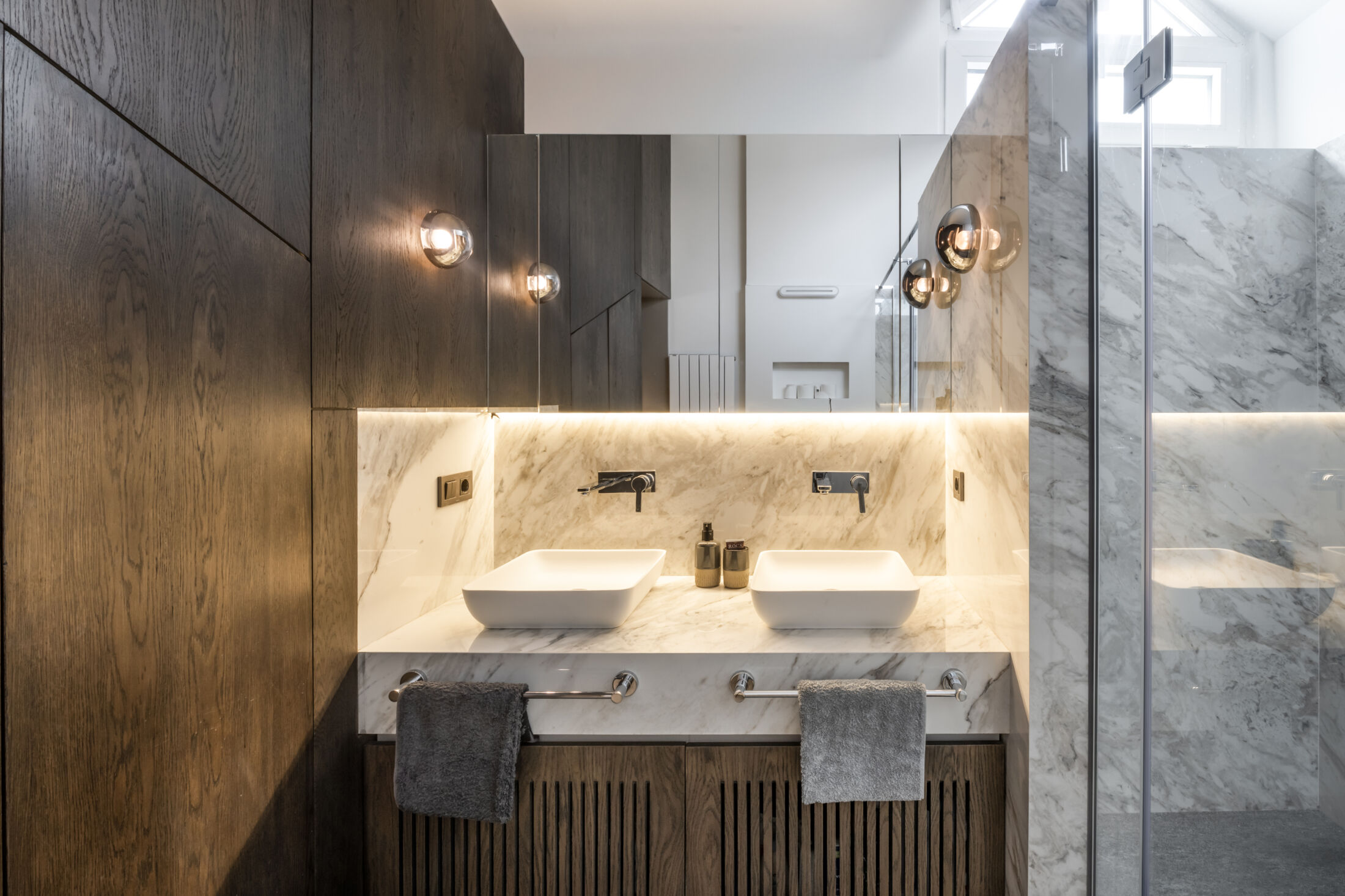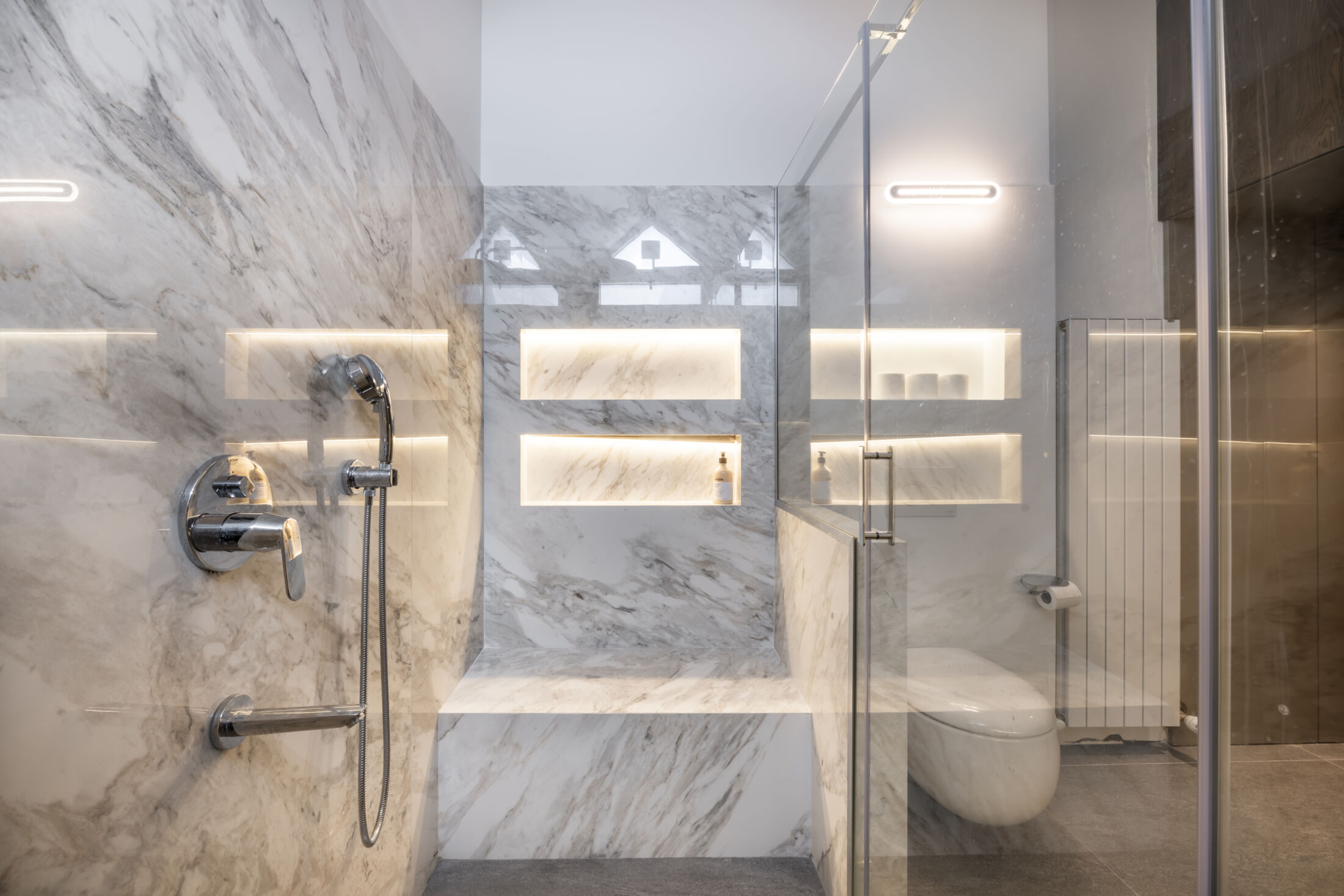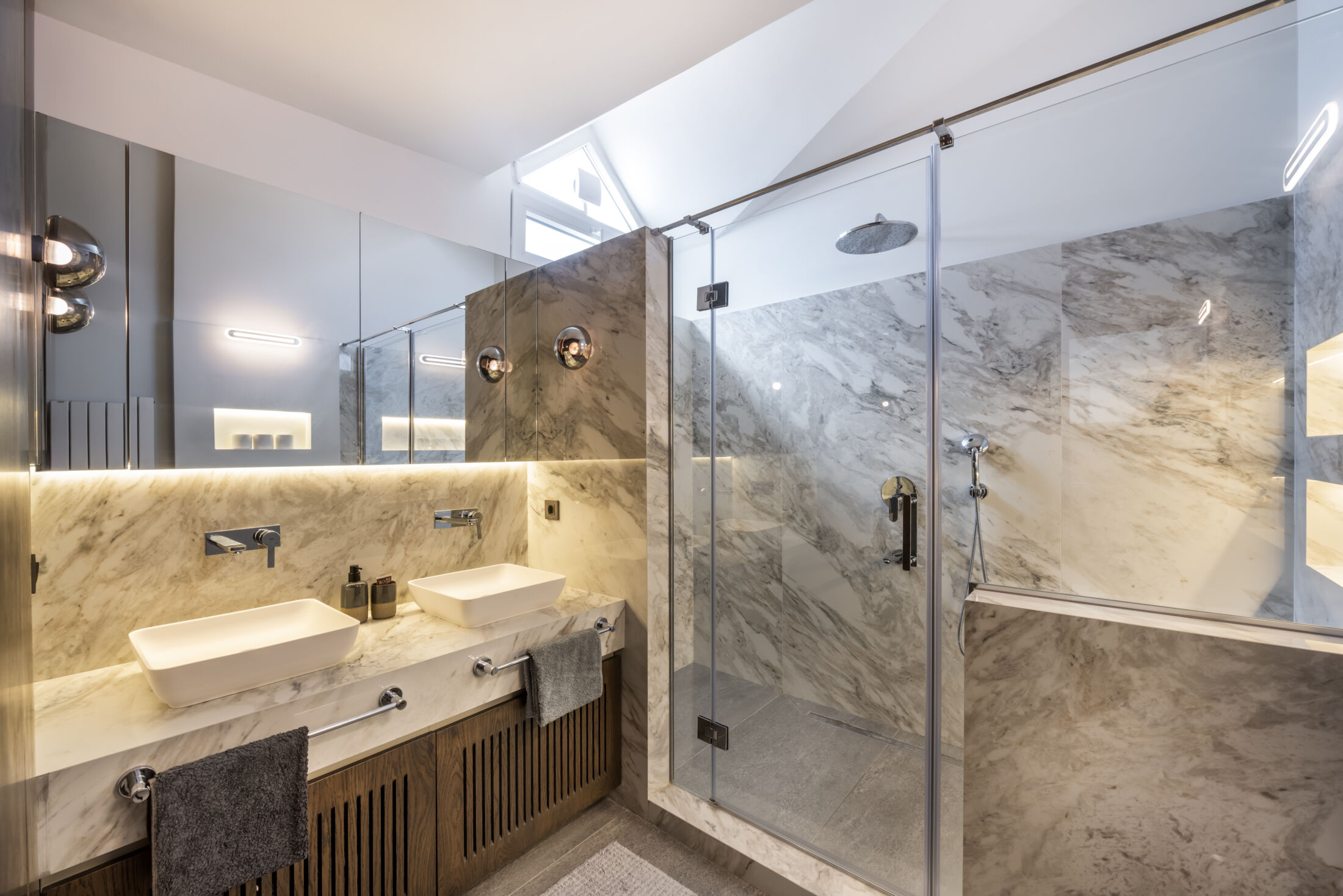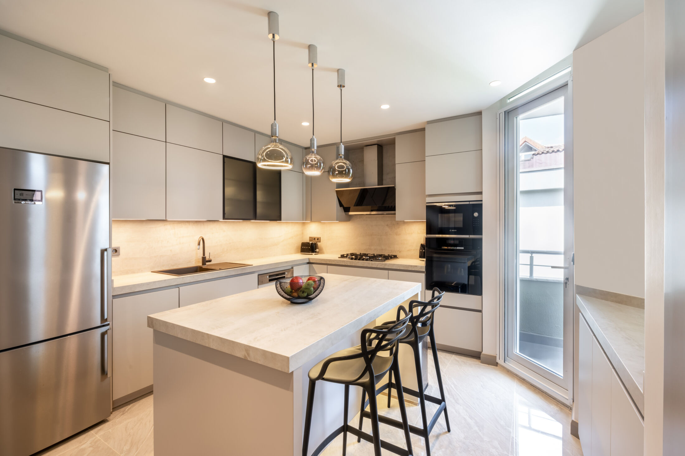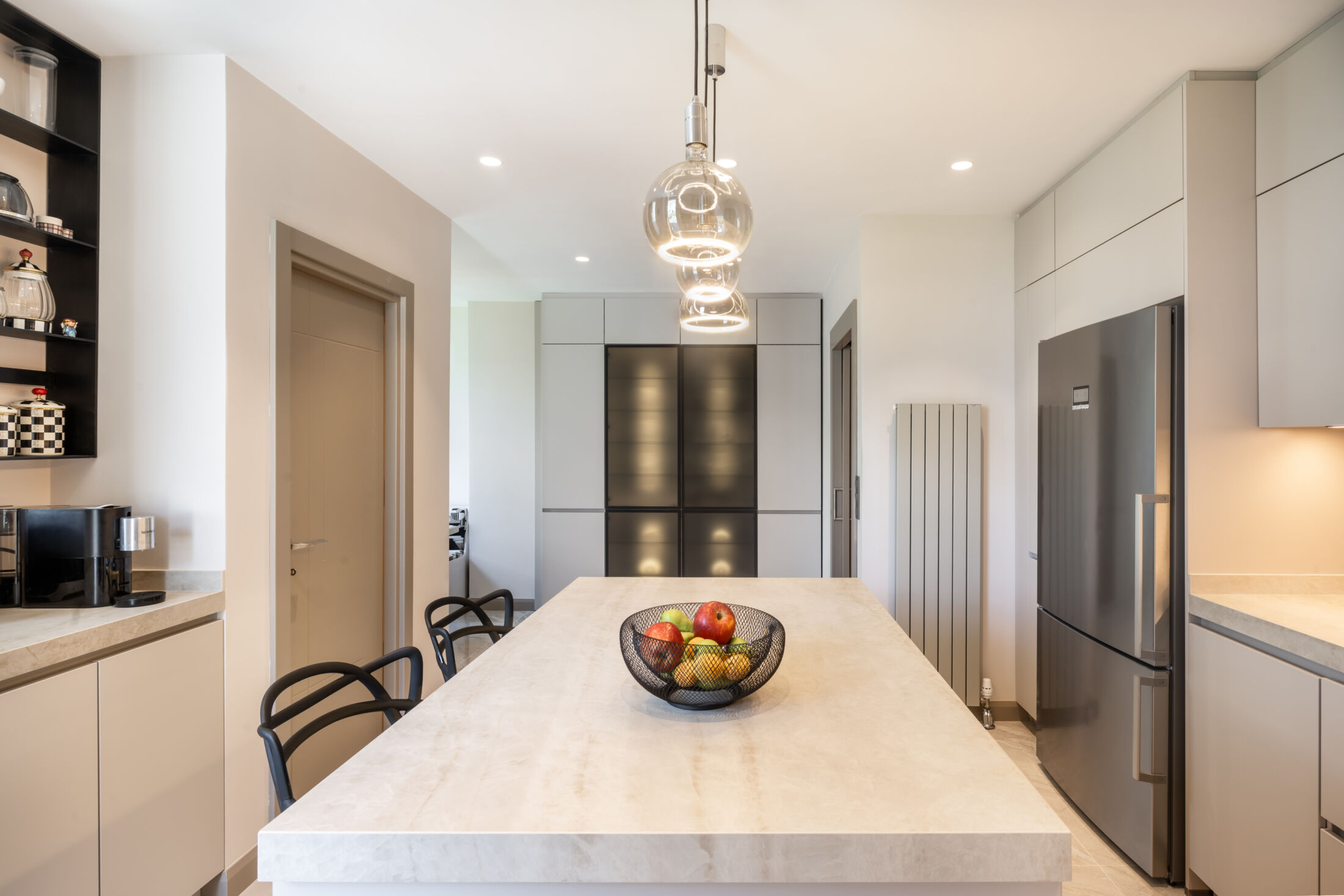 Upon reaching the upper floor, a transitional hall leads to the primary bedroom, which features a private terrace and an en-suite bathroom, offering both comfort and privacy. An additional elevated platform within this level houses a study, a dressing room, and a shared bathroom, creating a distinct yet connected functional arrangement. Bathrooms feature expansive glass partitions and natural stone surfaces, enhancing light and continuity. A staircase with integrated lighting acts as a sculptural element, connecting the spaces seamlessly. Throughout the house, concealed lighting and material textures create an understated yet sophisticated ambiance, making ENO House a contemporary living space shaped for comfort and everyday elegance.