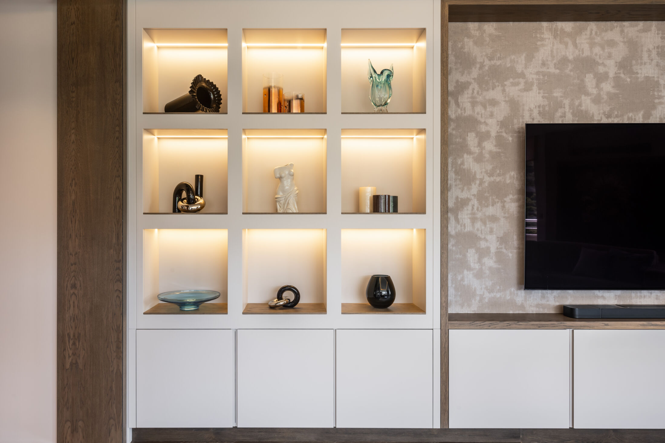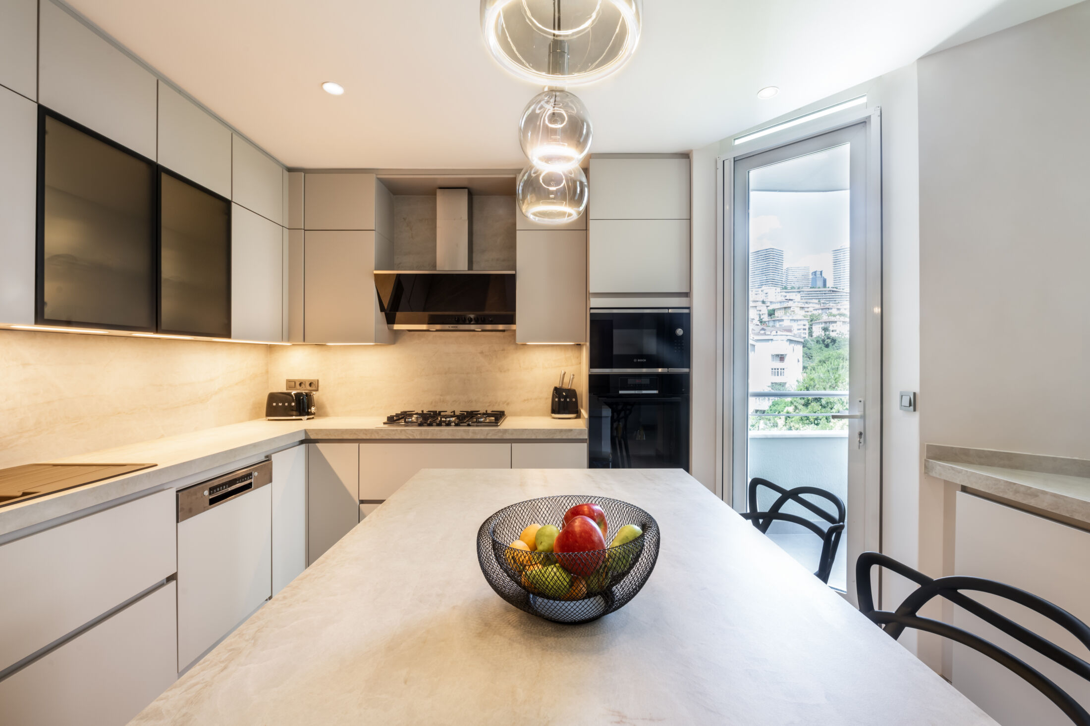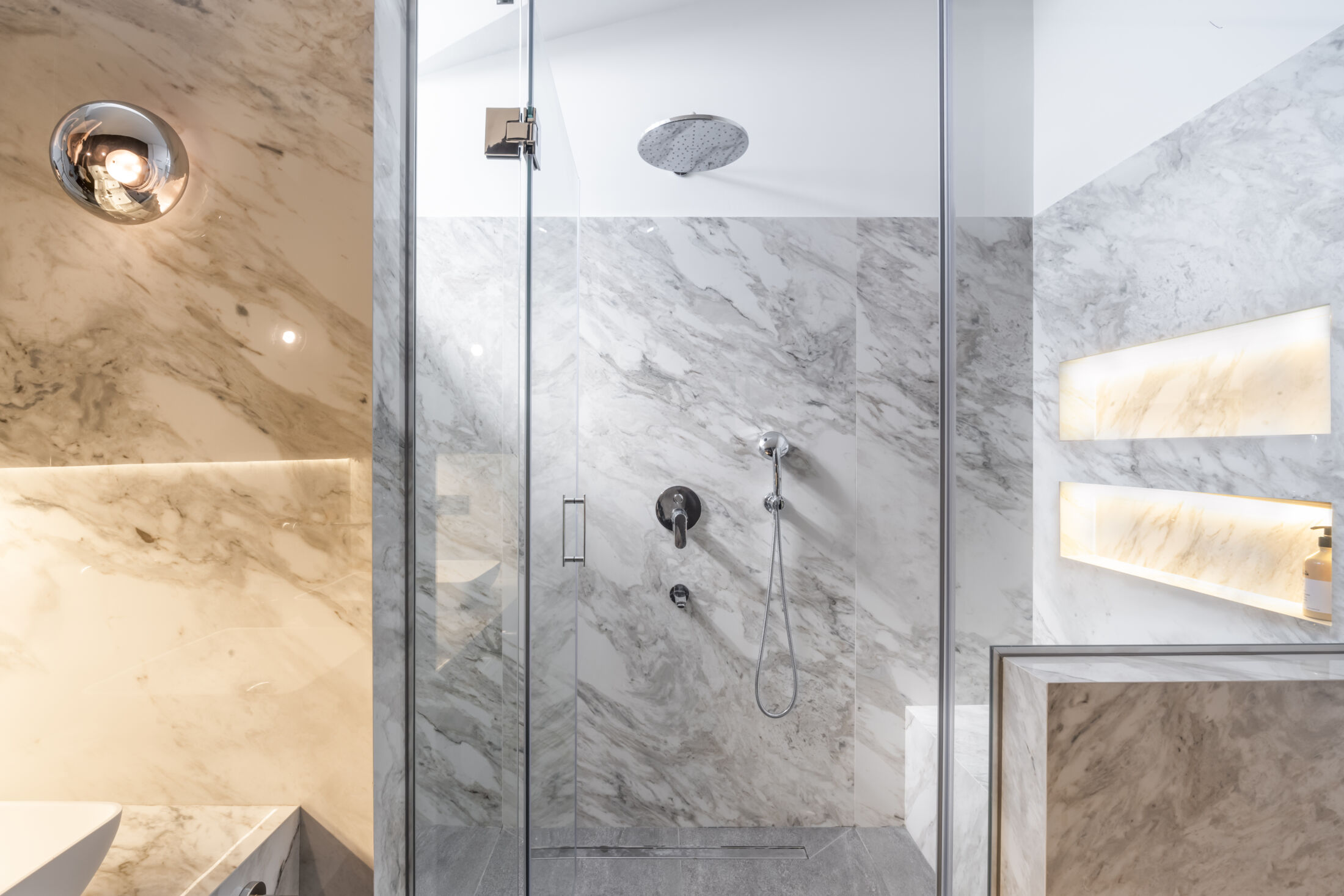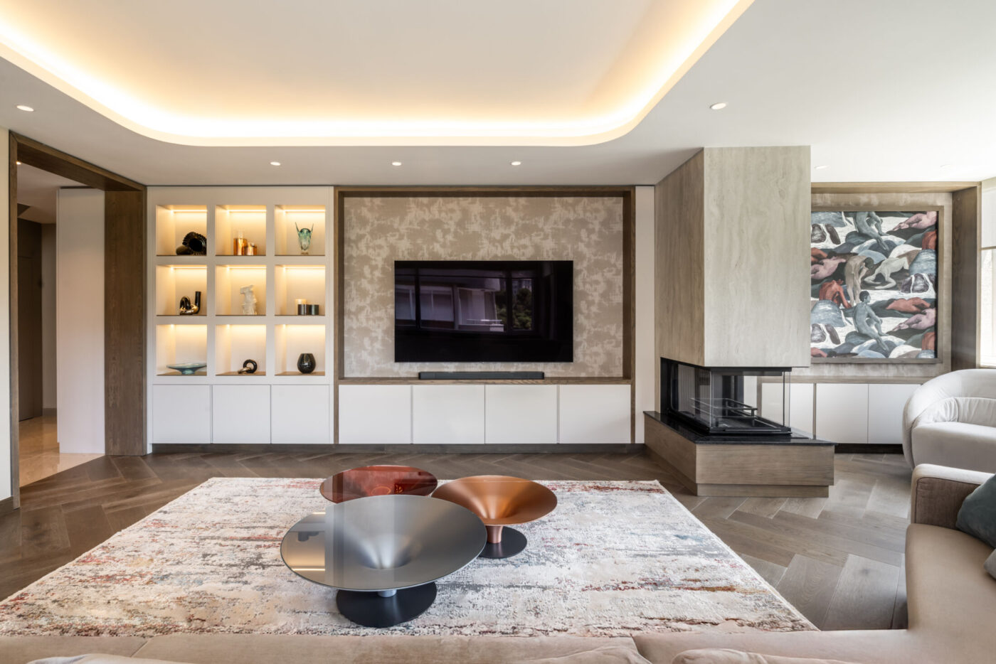 Upon reaching the upper floor, a transitional hall leads to the primary bedroom, which features a private terrace and an en-suite bathroom, offering both comfort and privacy. An additional elevated platform within this level houses a study, a dressing room, and a shared bathroom, creating a distinct yet connected functional arrangement. Bathrooms feature expansive glass partitions and natural stone surfaces, enhancing light and continuity. A staircase with integrated lighting acts as a sculptural element, connecting the spaces seamlessly. Throughout the house, concealed lighting and material textures create an understated yet sophisticated ambiance, making ENO House a contemporary living space shaped for comfort and everyday elegance.