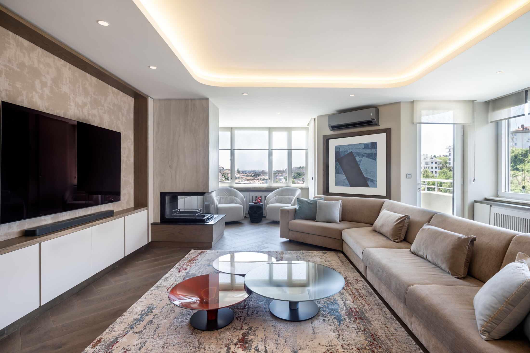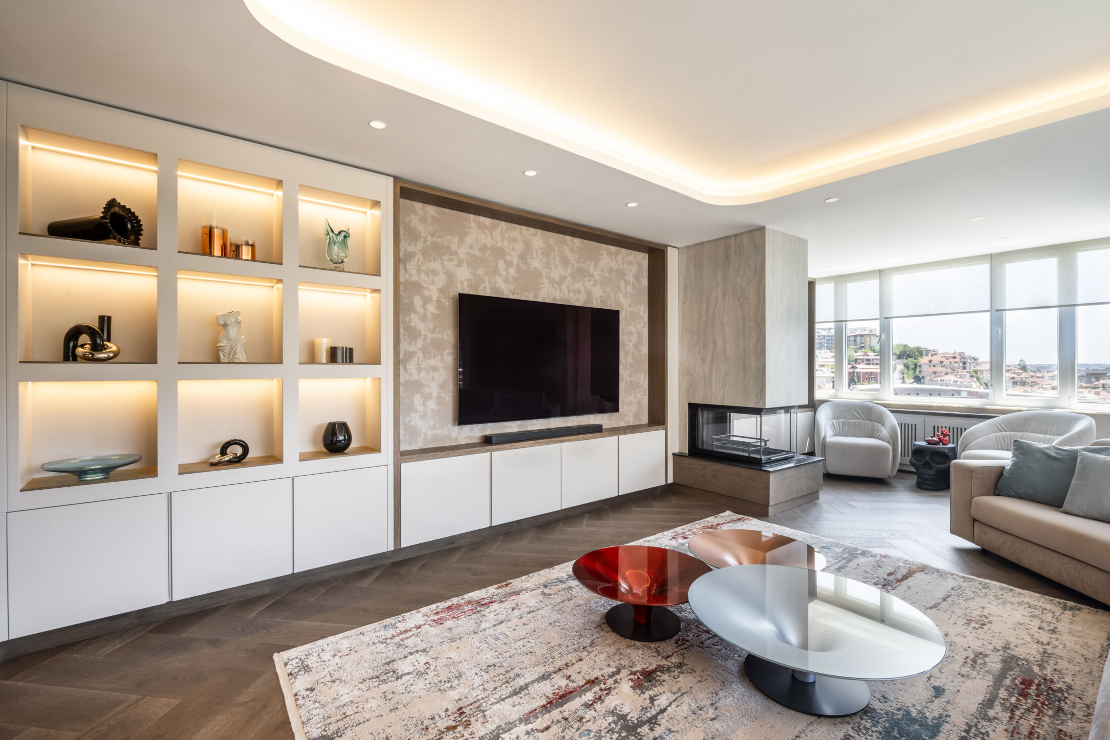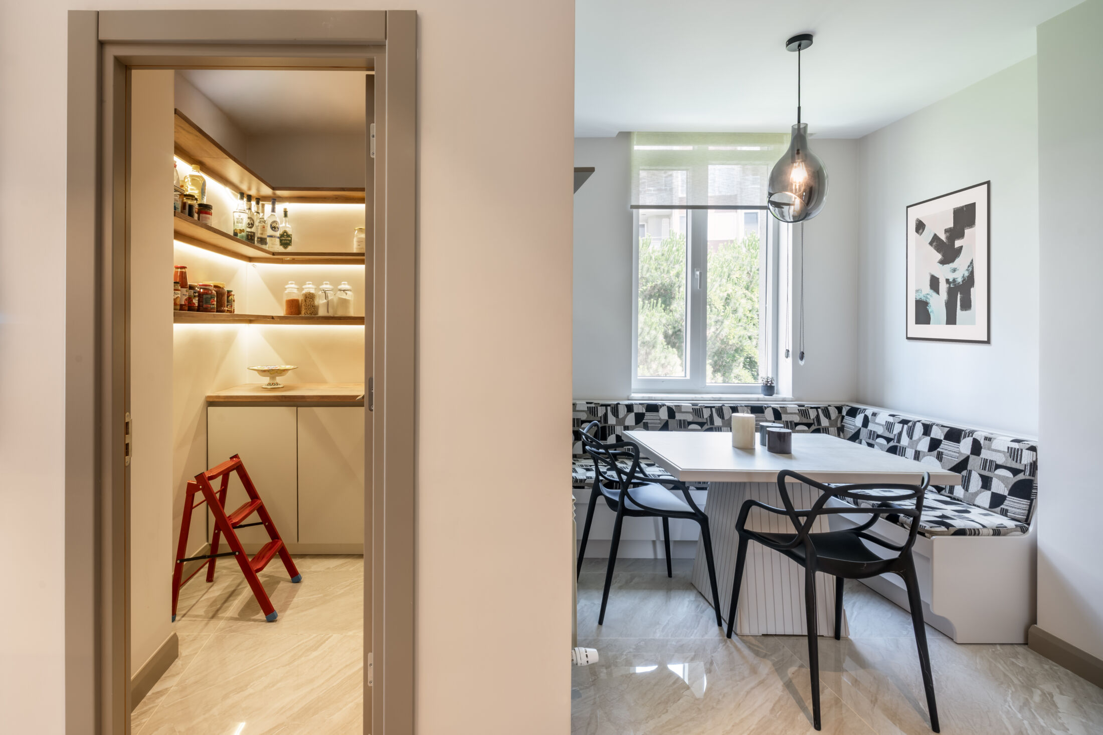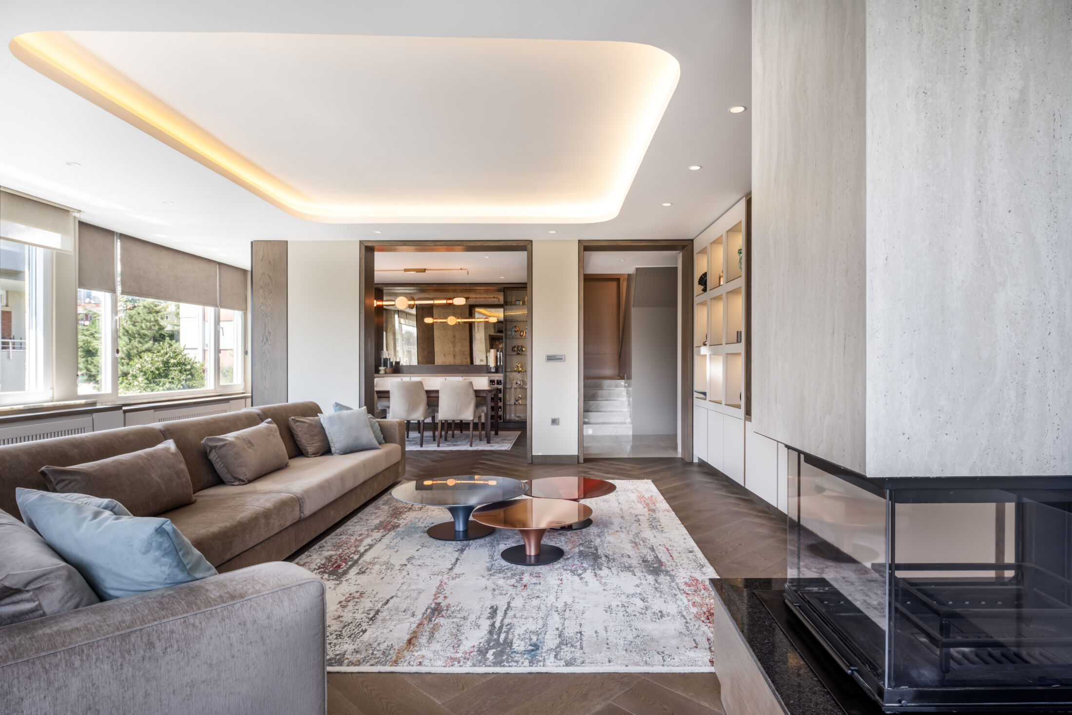 Located in Ulus, Istanbul, ENO House is designed as a refined urban residence, balancing functionality and warmth. The interior design emphasizes natural materials, soft transitions, and a neutral palette that enhances spatial flow. The ground floor consists of a dining space, and living room that form a continuous yet subtly defined spatial sequence, where the dining space is positioned within an extended living zone rather than being a separate, enclosed room. This arrangement enhances connectivity while maintaining functional distinction, reinforced by built-in elements and material transitions.Built-in shelving and a fireplace create a focal point in the living room. On the upper platform within this level, a defined kitchen area, a children's room and a bathroom are situated, ensuring a functional separation of spaces.